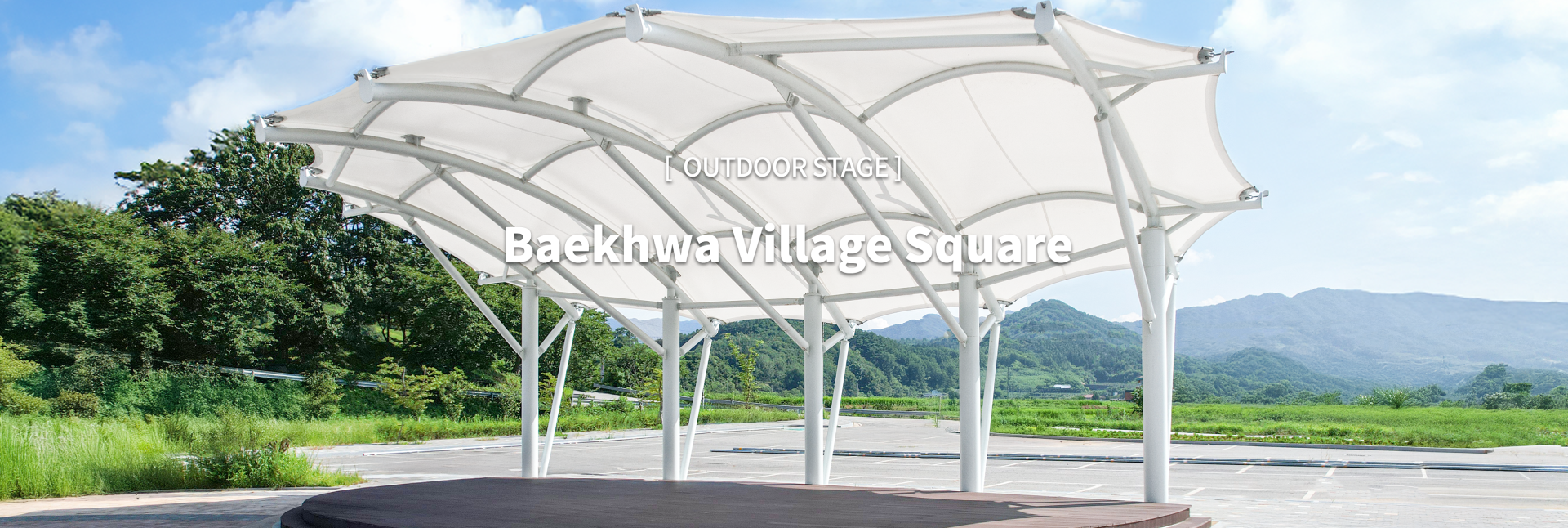 백화마을의 광장이 둥근형태로 낮은 목재테크를 살짝 덮을 수 있는 그늘막을 디자인하였으며, 중앙의 주기둥을 타이백 형태로 잡아주어 안정감을 추가하였습니다.