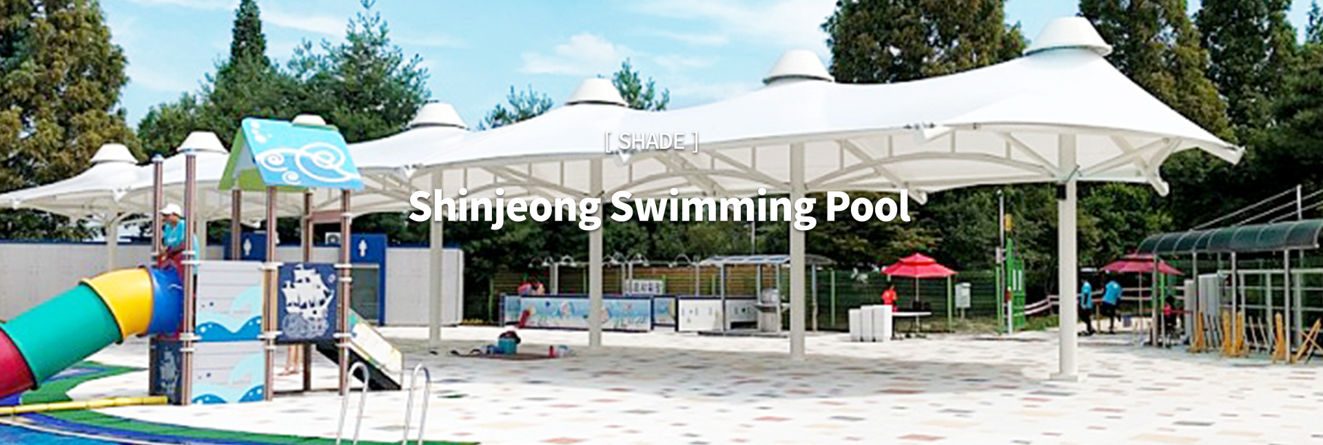 물놀이장의 전반적인 곡선 형태의 유려한 디자인을 적극 반영하여 물놀이장의 경계를 따라 유선형 배치 및 동그란 솟을지붕 포인트를 활용하였습니다. 두가지 형상의 그늘막 구조물이 설치